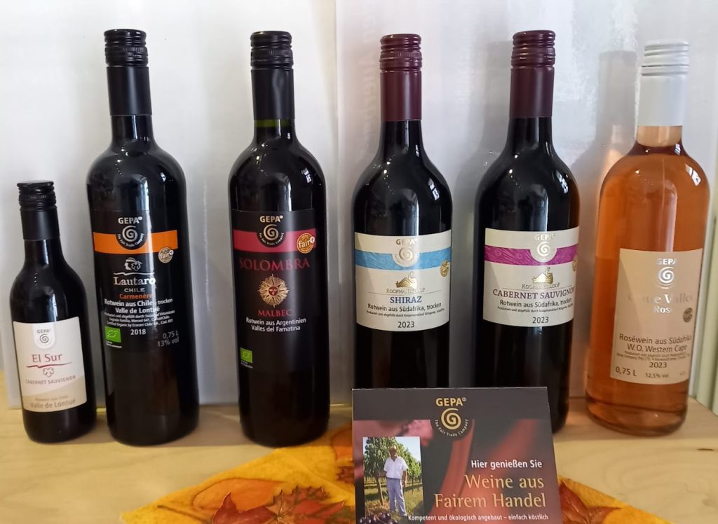 Am 7.11. laden wir zur Veranstaltung “Faire Weine aus aller Welt” ein. Faire Weine, die in Weltläden verkauft werden, stammen fast ausschließlich aus Südamerika (Argentinien und Chile) oder aus der Kap-Provinz Südafrikas. Welche Weine sind das, wie werden sie produziert und vor allem, was zeichnet diese Weine aus, damit sie als fair produziert und fair gehandelt gekennzeichnet werden? Dieser Frage gehen wir nach, selbstverständlich mit einer Verkostung einiger typischen Weine. Der Vortrag beinhaltet auch Infos über die Weinbauregionen, die der Referent aus eigener Anschauung kennt.