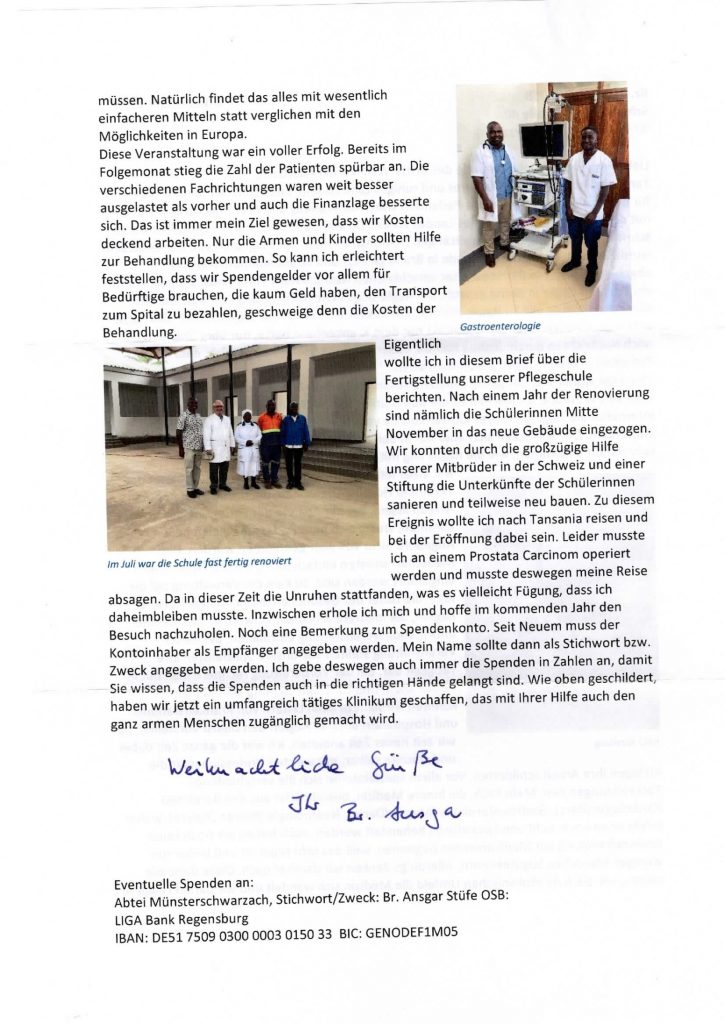 Auch dieses Jahr bekamen wir wieder einen Brief von Bruder Angar Stüfe, der einen Überblick über das vergangene Jahr gewährt. Das Peramiho Krankenhaus wurde weiter auf den neuesten Stand der Technik gebracht, die bisherige Ausrüstung muss gewartet oder eventuell erneuert werden. Damit dies auch weiterhin möglich ist, ist man immer wieder auf Hilfe von außen angewiesen. Der Staat Tansania nimmt zwar großen Anteil an der Arbeit des Krankenhauses, kann sich aber finanziell kaum beteiligen, da er komplett überschuldet ist. Trotzdem ist es wichtig, gute Beziehungen zu den Regierungsvertretern zu unterhalten, auch wenn dies manchmal mit großem Aufwand verbunden ist. Wir freuen uns sehr, dass der Jahresrückblick wieder so positiv ausgefallen ist: